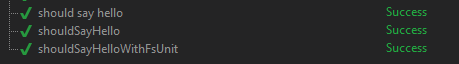 Here we call SayHello "World", and pipe the output to the should equal "Hello World!" function using the |> operator. This works just the same as our previous test, but looks more F#ish and reads a bit more nicely.